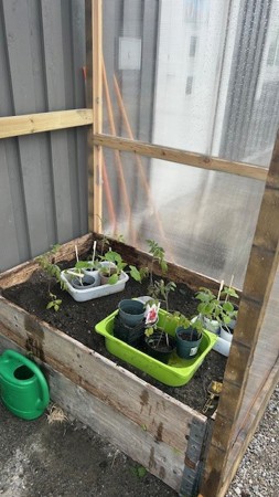 Nytt av året er at foreldrene har laget et flott drivhus til oss. Nå kan plantene få en trygg og lun start før de flyttes ut i bedene. I fjor hadde vi et lite drivhus – helt til vinden tok det!